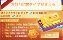 年パスの場合、年間2,200円でダイヤが累計48,730個+VIPポイントが128もらえます。