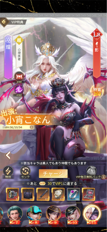 VIPレベルは最大11まで存在し、なかには美人(実在するセクシー女優を冠したキャラ)を獲得できることもありますね。