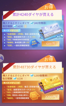 年間は年に1回のみ、月パスは毎月購入して7,200円なので、1年につき1万円弱で快適にゲームが進められるなら、長くプレイしている人ほど両方購入しても損はないでしょう。
