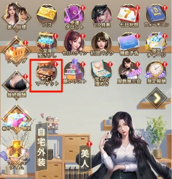 レベル8になり、かつイベント開催中であればTOP画面に『ナイトマーケット』が追加されています(下画像の赤枠で囲っているアイコン)。
